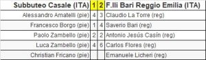 In the teams event, F.lli Bari Reggio Emilia (ITA) beat Subbuteo Casale (ITA) 2-1